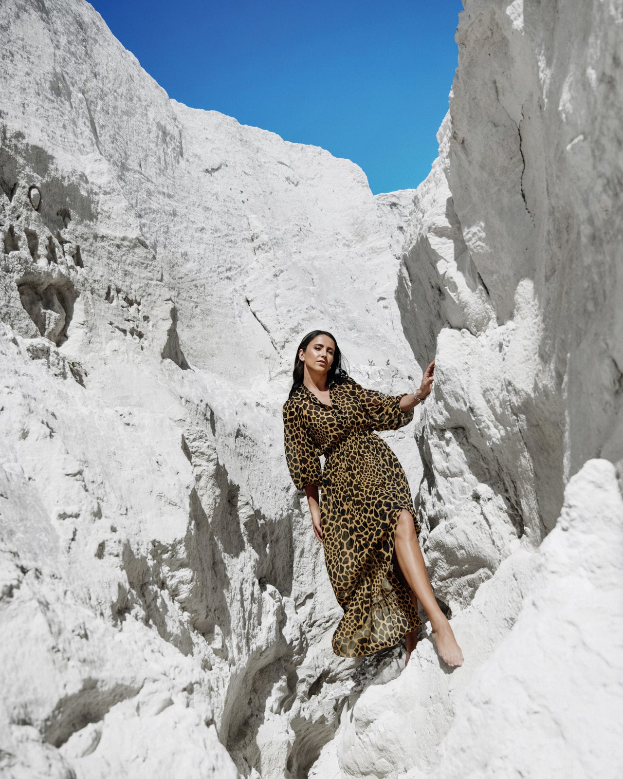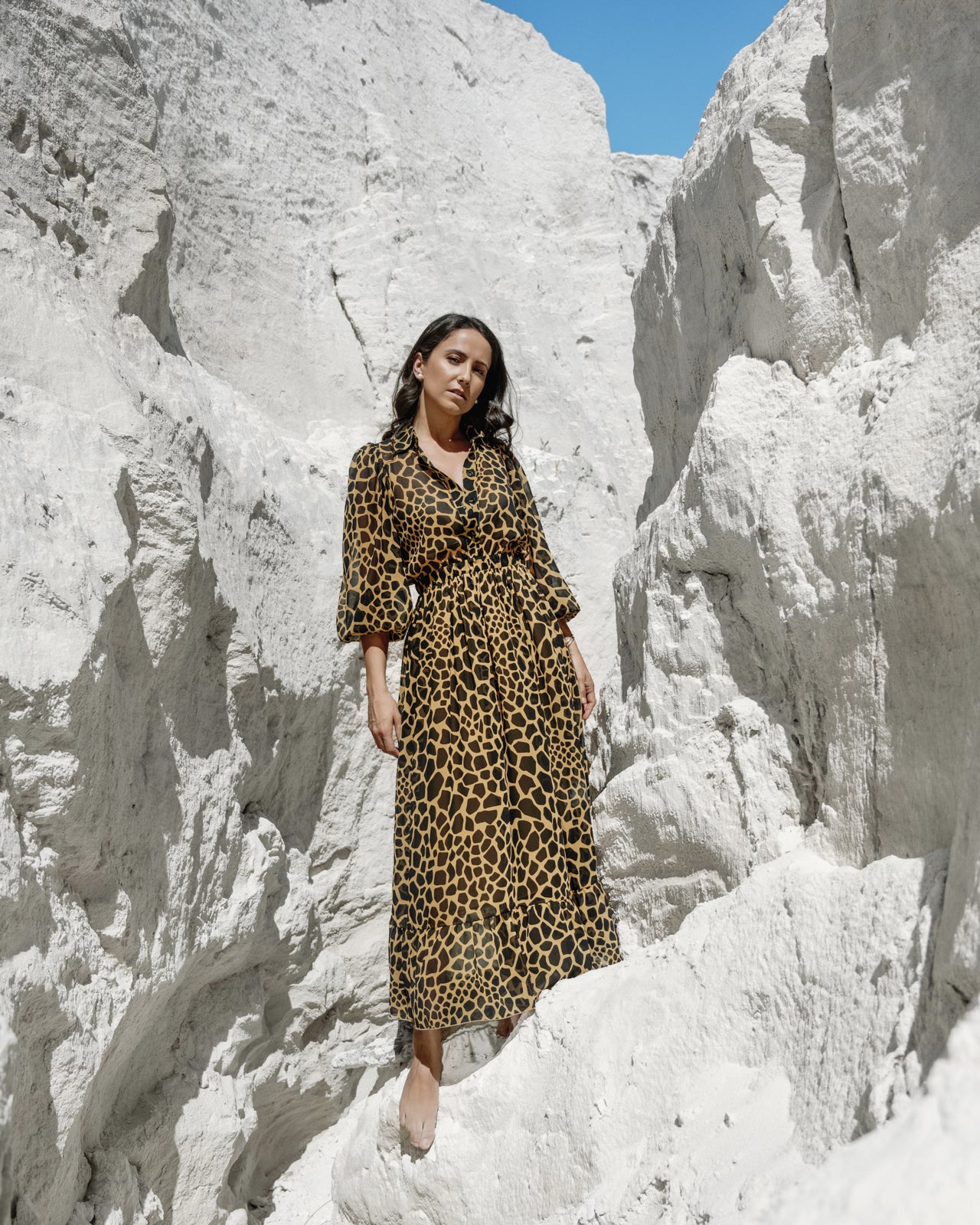 Channel your inner wild spirit with The Giselle, a timeless masterpiece. Crafted in a luxurious, lightweight fabric, this dress features an alluring animal print that exudes both sophistication and a daring edge. With billowy sleeves and a flattering, cinched waist, The Giselle is perfect for making a statement wherever you go, from a sunlit afternoon adventure to an elegant evening soirée. Let The Giselle be your ultimate expression of fearless elegance.